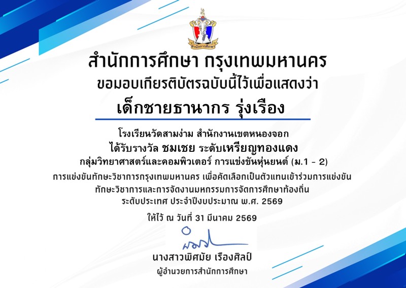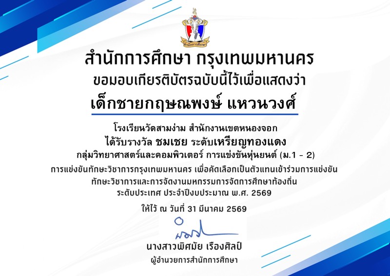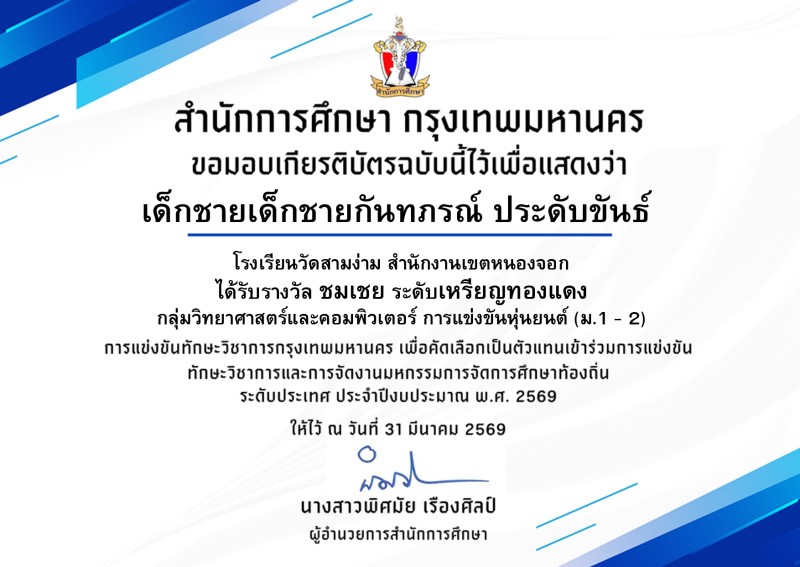 ยินดีกับทีมหุ่นยนต์โรงเียนวัดสามง่าม ได้รับรางวัล ชมเชย ระดับเหรียญทองแดง กลุ่มวิทยาศาสตร์และคอมพิวเตอร์ การแข่งขันหุ่นยนต์ (ม.1-2)